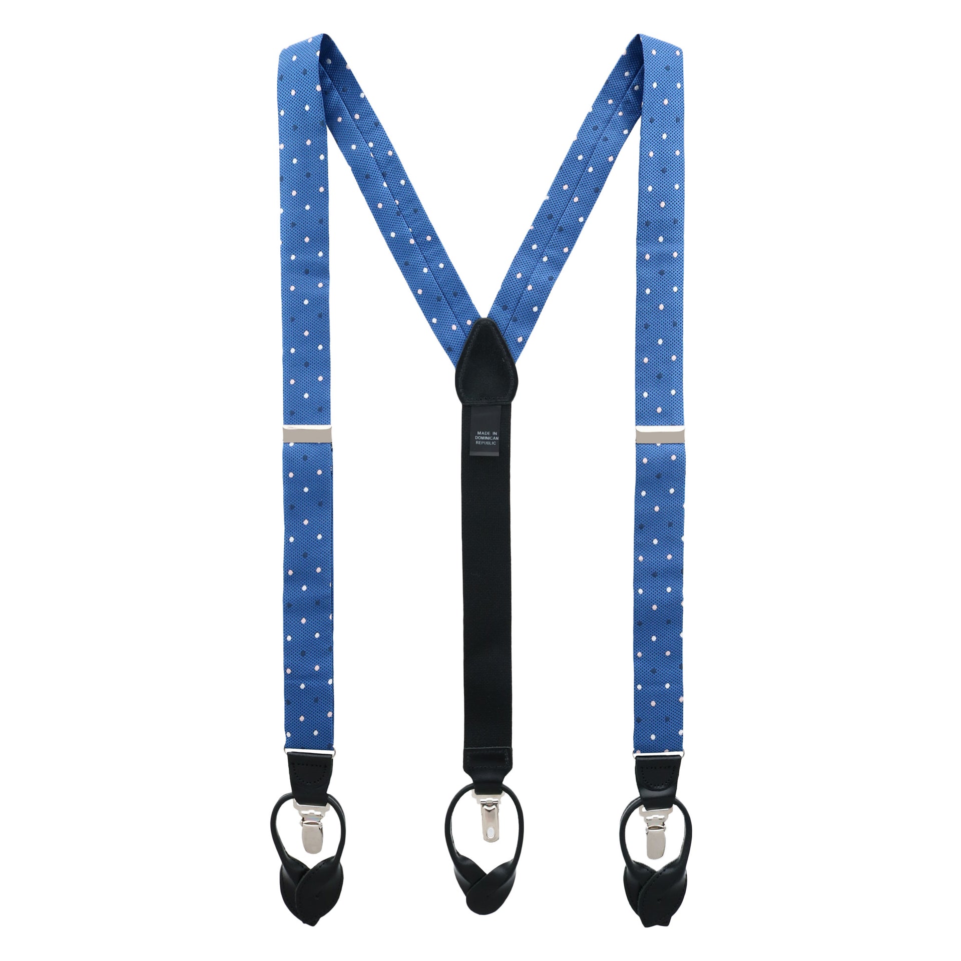 A beautiful base of blue with navy pin dot silk adorned by white and navy polka-dot design gives this brace a million dollar look that every man should have in his wardrobe. Whether it is with a suit for a board meeting or a pair of jeans for a night on the town, these convertible suspenders will give you the extra boost of confidence to let the man inside you shine and achieve your goals.